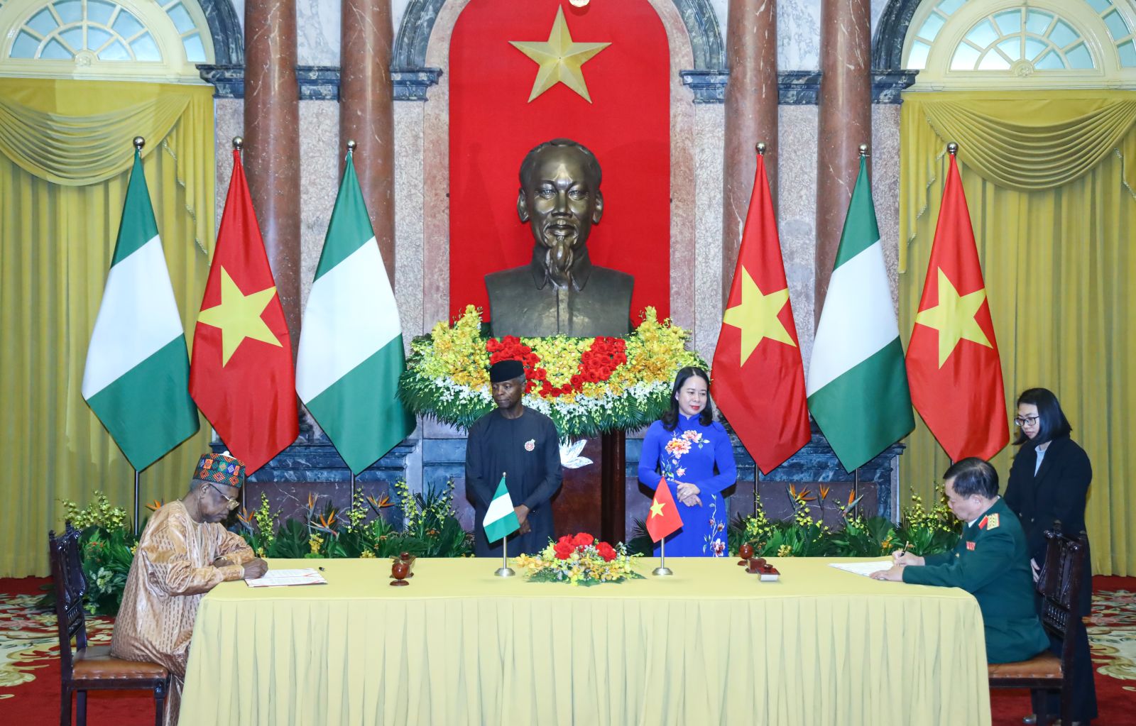 Phó Chủ tịch nước Võ Thị Ánh Xuân và Phó Tổng thống nước Cộng hòa Liên bang Nigeria Yemi Osinbajo chứng kiến Bản ghi nhớ giữa Bộ Quốc phòng nước Cộng hoà xã hội chủ nghĩa Việt Nam và Bộ Quốc phòng Cộng hoà Liên bang Nigeria về hợp tác quốc phòng. Ảnh: VPCTN