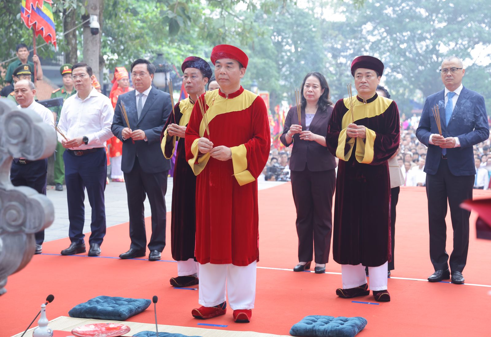 Phó Chủ tịch nước Võ Thị Ánh Xuân cùng các đại biểu thực hiện nghi thức dâng thương tại Đền Thỏng, Tây Thiên. Ảnh: VPCTN