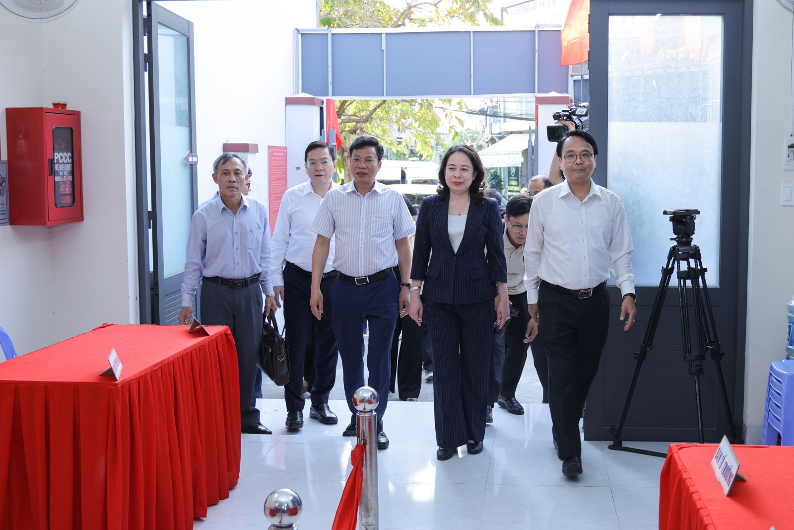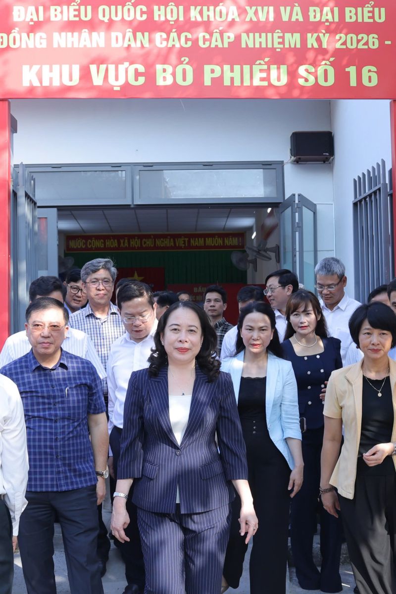 Phó Chủ tịch nước Võ Thị Ánh Xuân cùng Đoàn công tác khảo sát, kiểm tra tại Tổ bầu cử và khu vực bỏ phiếu phường Phan Thiết. Ảnh: VPCTN