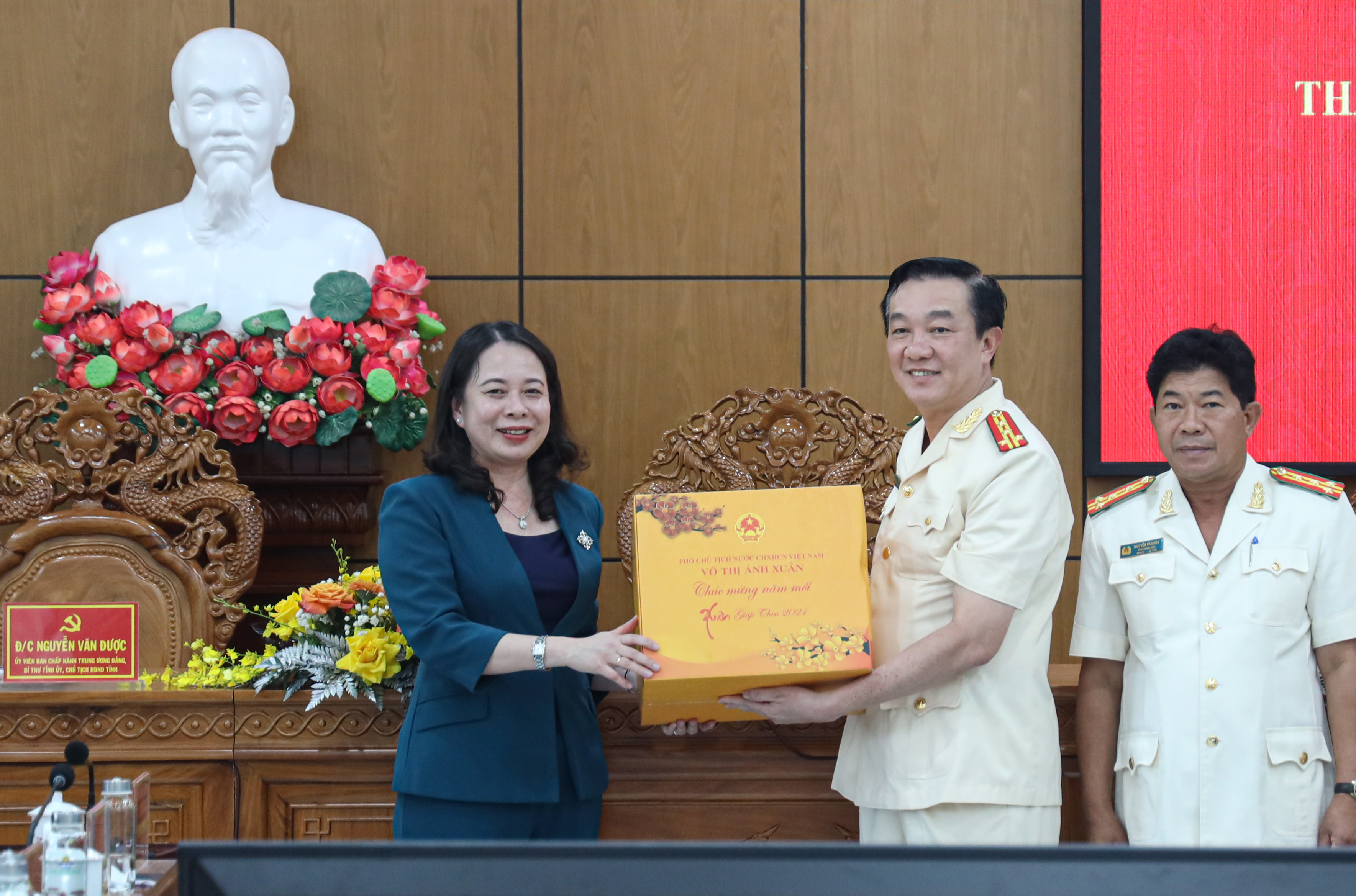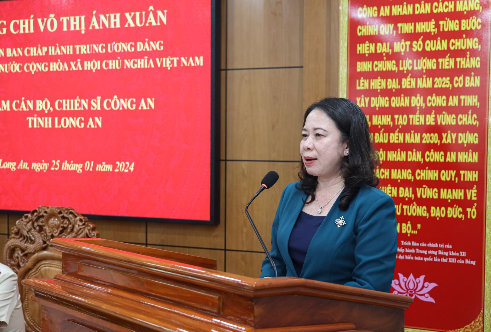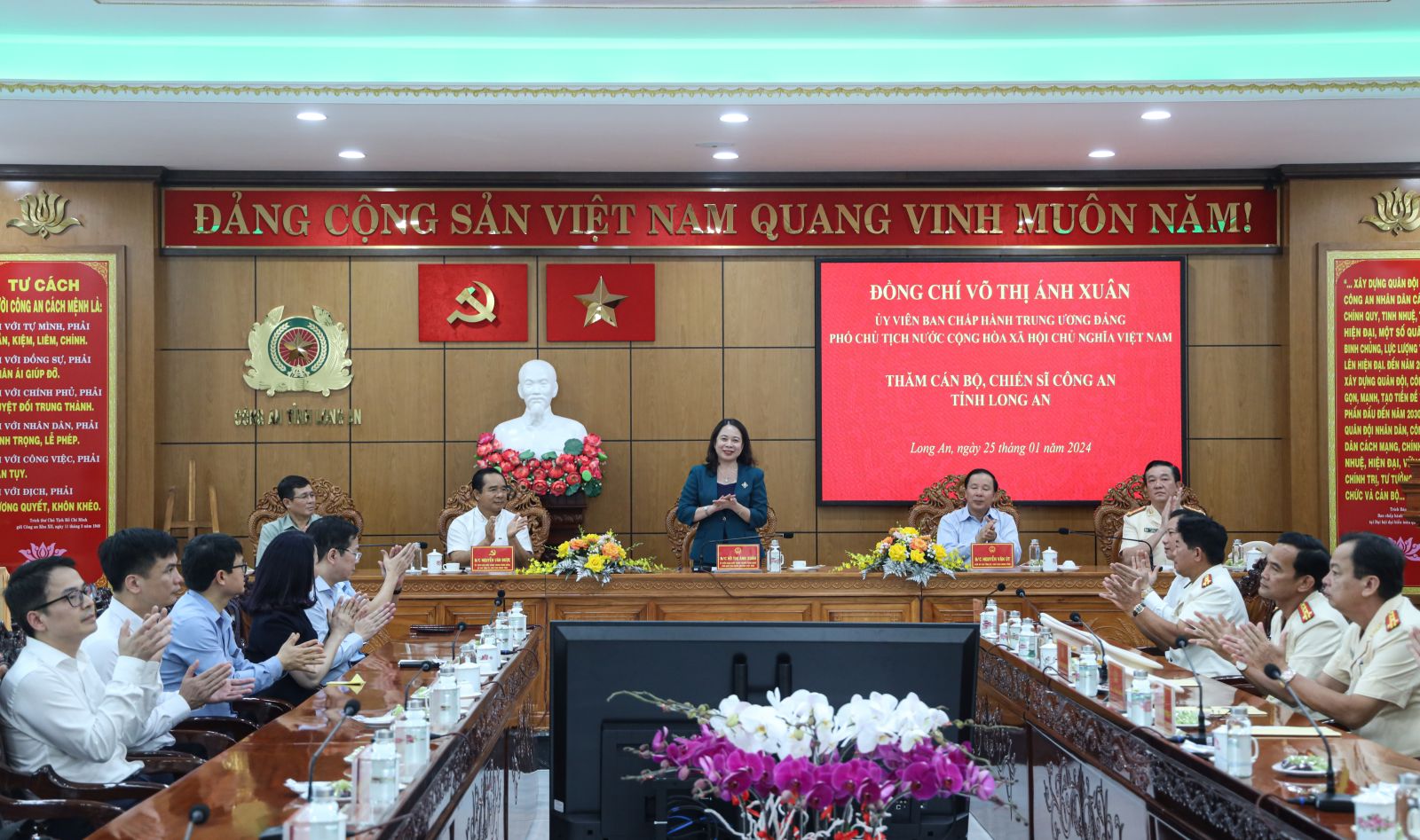 Phát biểu tại buổi làm việc, Phó Chủ tịch nước Võ Thị Ánh Xuân ghi nhận, biểu dương và chúc mừng những thành tích lực lượng Công an Long An đạt được trong công tác bảo đảm an ninh trật tự, cũng như thành tựu trong phát triển kinh tế - xã hội của tỉnh Long An. Nhân dịp chuẩn bị Tết Nguyên đán Giáp Thìn 2024, Phó Chủ tịch nước Võ Thị Ánh Xuân thay mặt lãnh đạo Đảng, Nhà nước gửi tới các đồng chí lãnh đạo tỉnh, Đảng ủy Ban Giám đốc Công an tỉnh, lãnh đạo Công an các huyện, thị xã và thành phố cùng toàn thể cán bộ chiến sĩ công an và gia đình những tình cảm thân thiết và lời chúc mừng tốt đẹp nhất.