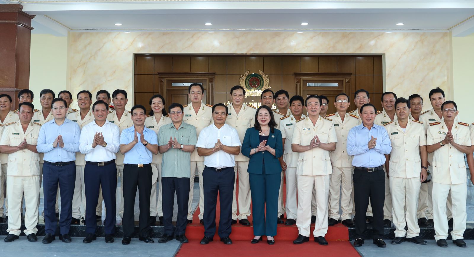 Phó Chủ tịch nước Võ Thị Ánh Xuân và các đại biểu chụp ảnh chung với cán bộ, chiến sĩ Công an tỉnh Long An. Ảnh: VPCTN