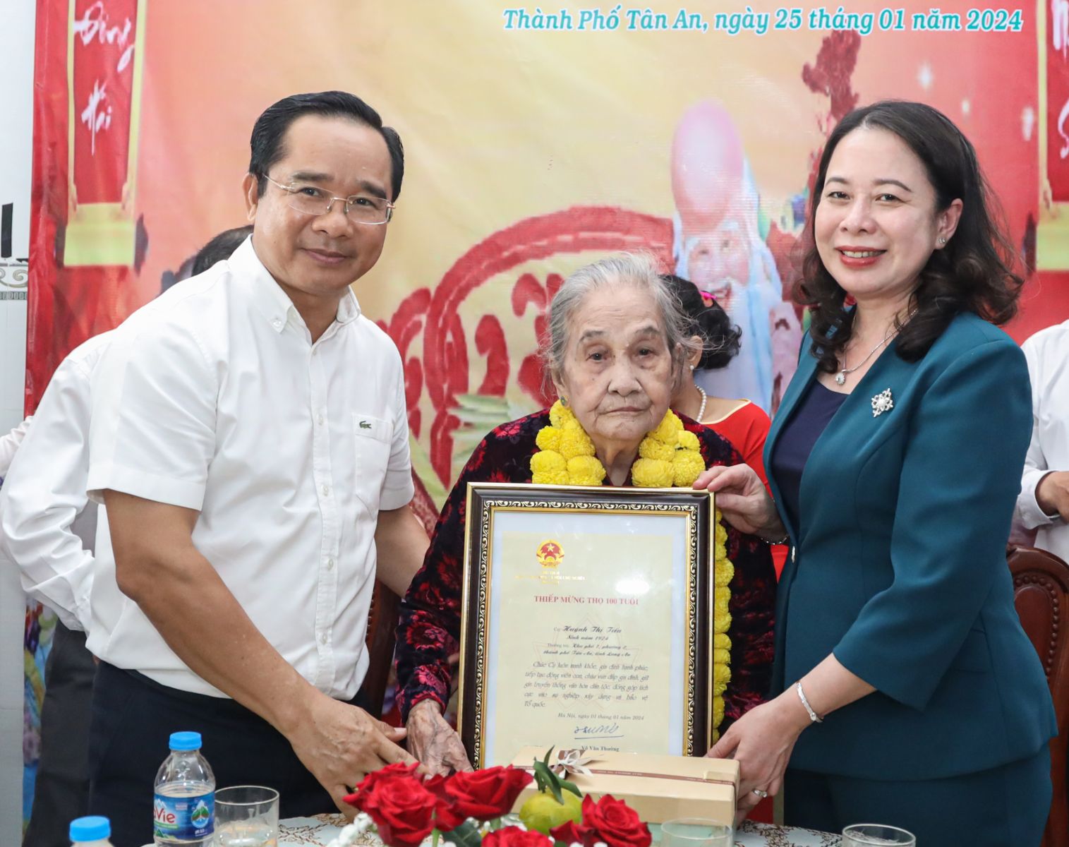 Phó Chủ tịch nước Võ Thị Ánh Xuân trao Thiếp Mừng thọ 100 tuổi của Chủ tịch nước cho Việt Nam Anh hùng Huỳnh Thị Tiếu. Ảnh: VPCTN