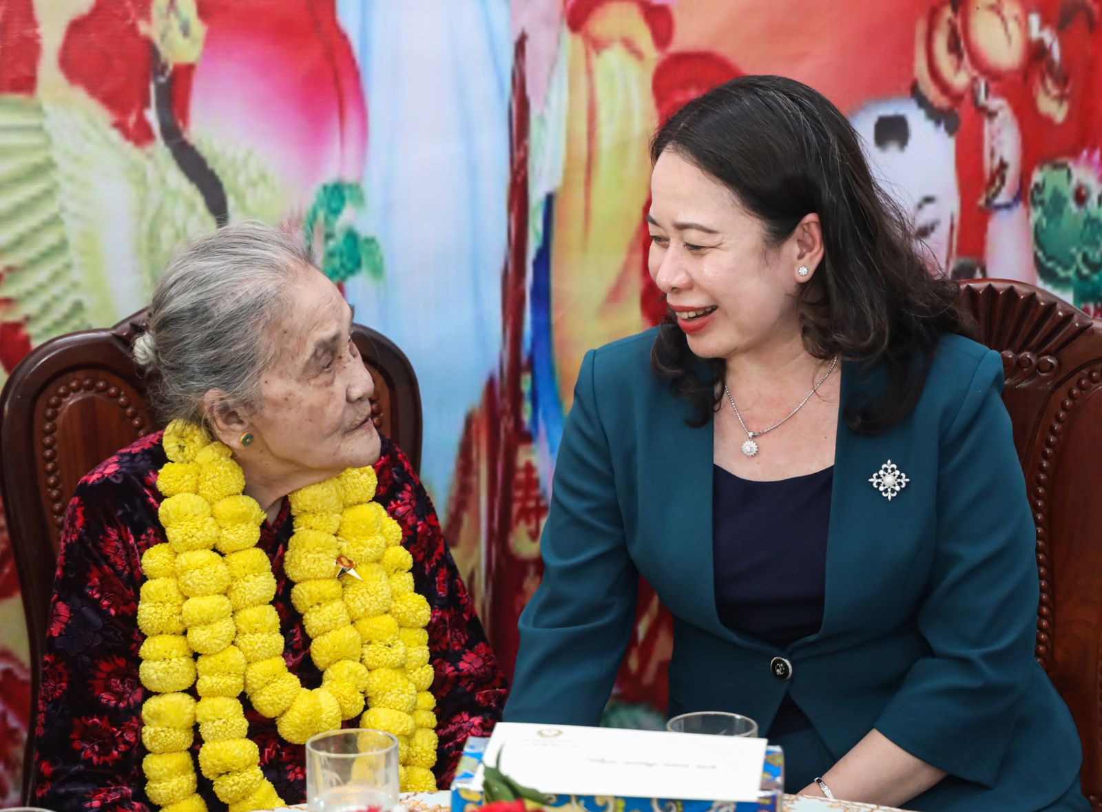 Phó Chủ tịch nước Võ Thị Ánh Xuân thăm, chúc Tết Mẹ Việt Nam Anh hùng Huỳnh Thị Tiếu. Ảnh: VPCTN
