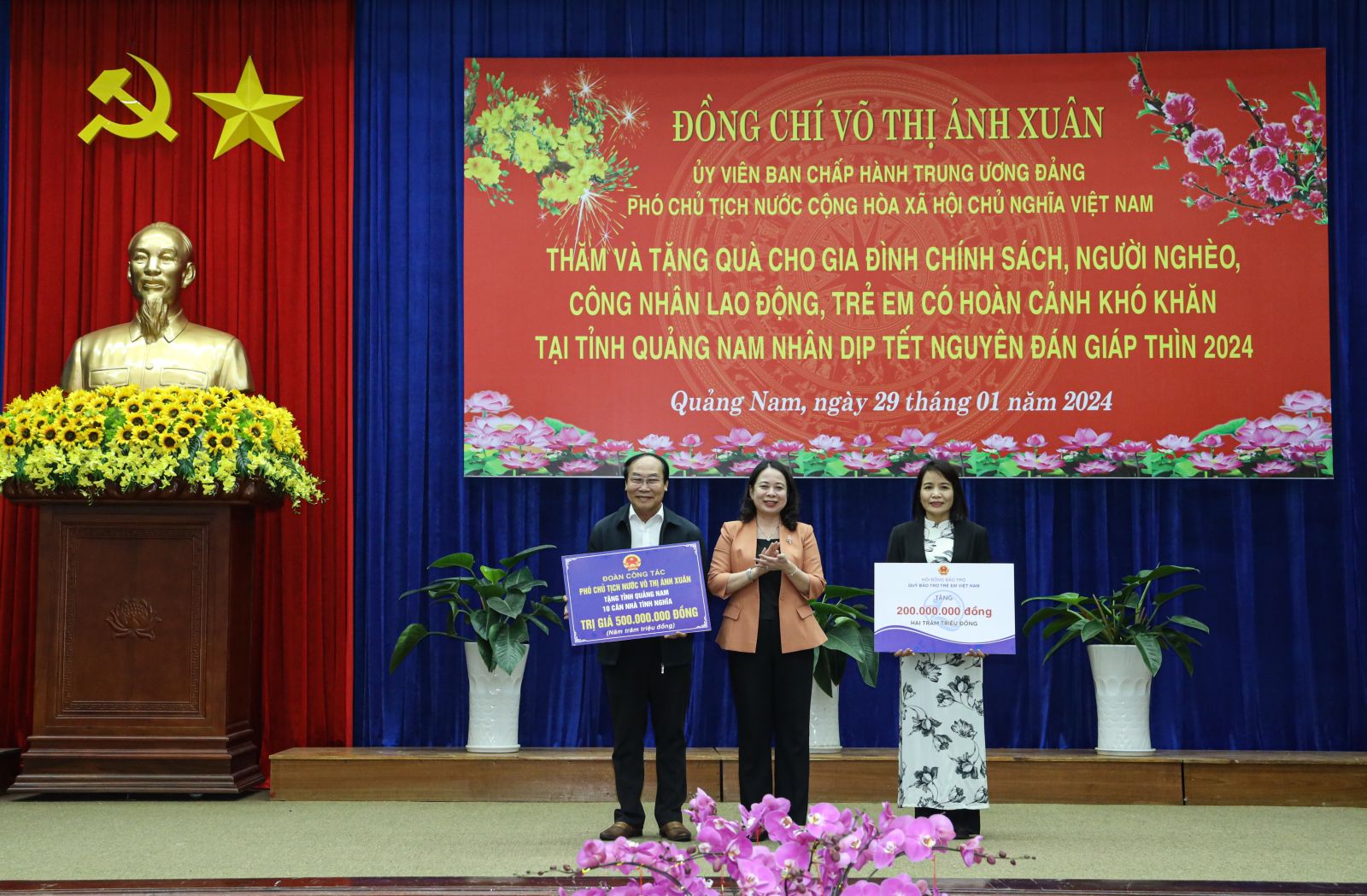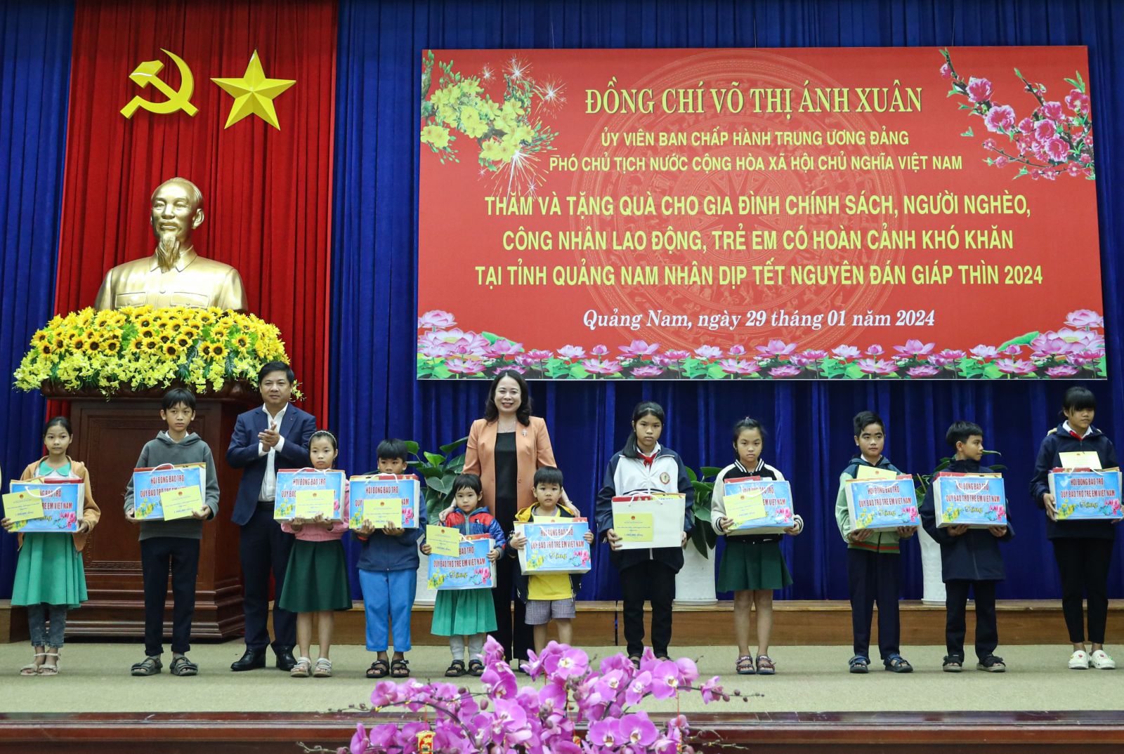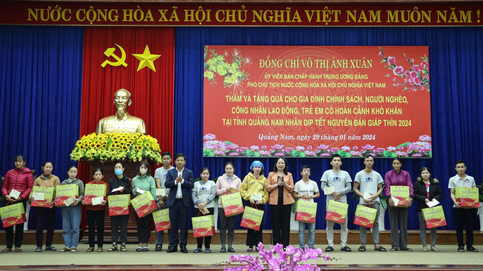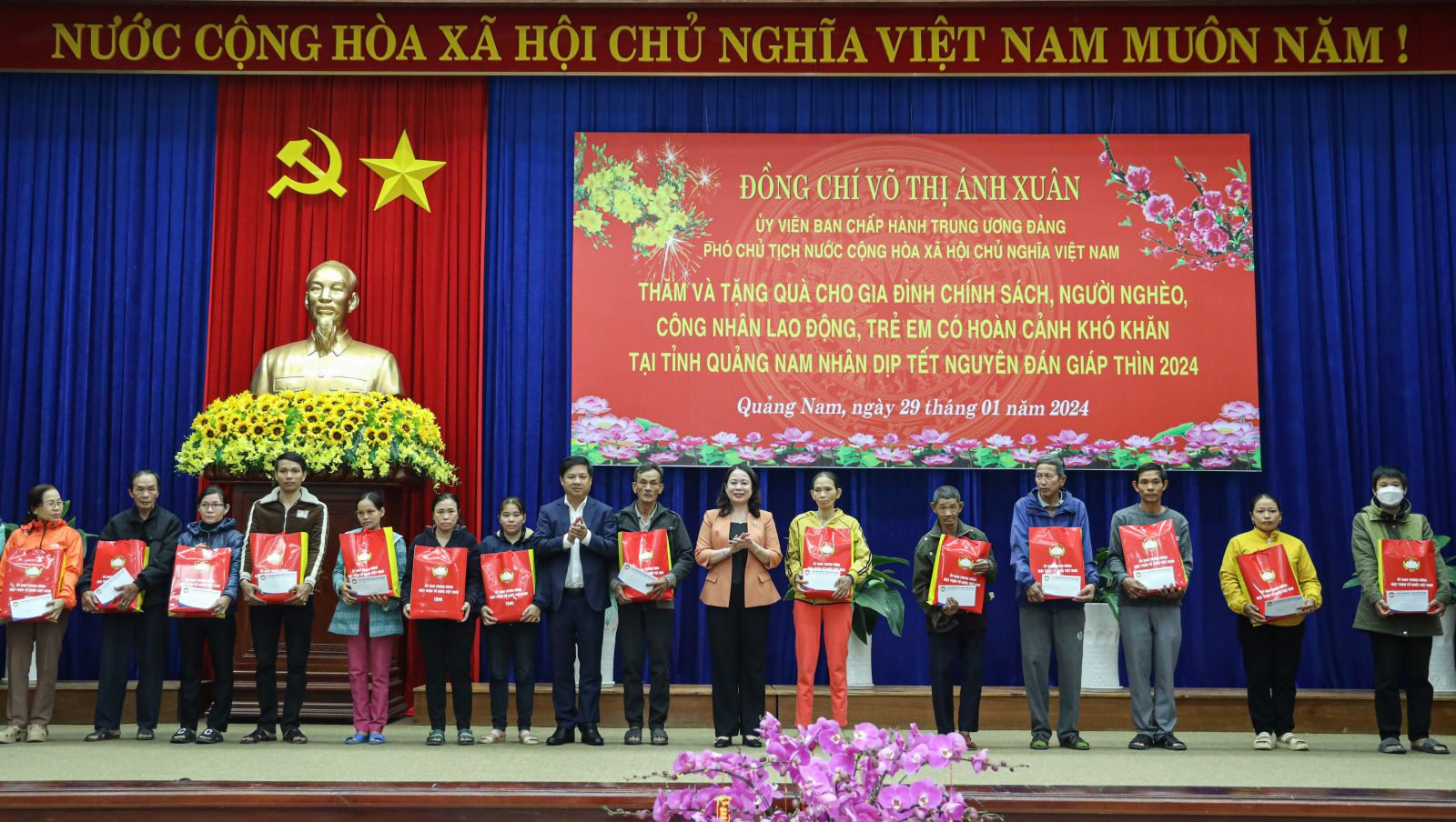 Thay mặt lãnh đạo Đảng, Nhà nước, Phó Chủ tịch nước Võ Thị Ánh Xuân gửi lời chúc mừng năm mới an khang, hạnh phúc, giành nhiều thắng lợi mới đến Đảng bộ, chính quyền và nhân dân tỉnh Quảng Nam. Phó Chủ tịch nước cùng đoàn công tác đã trao tặng tỉnh Quảng Nam 10 căn nhà tình nghĩa trị giá 500 triệu đồng cùng 200 triệu đồng cho trẻ em có hoàn cảnh khó khăn của tỉnh. Đồng thời, Phó Chủ tịch nước cũng trao tặng 400 phần quà Tết cho gia đình chính sách, người nghèo, công nhân lao động trên địa bàn tỉnh.