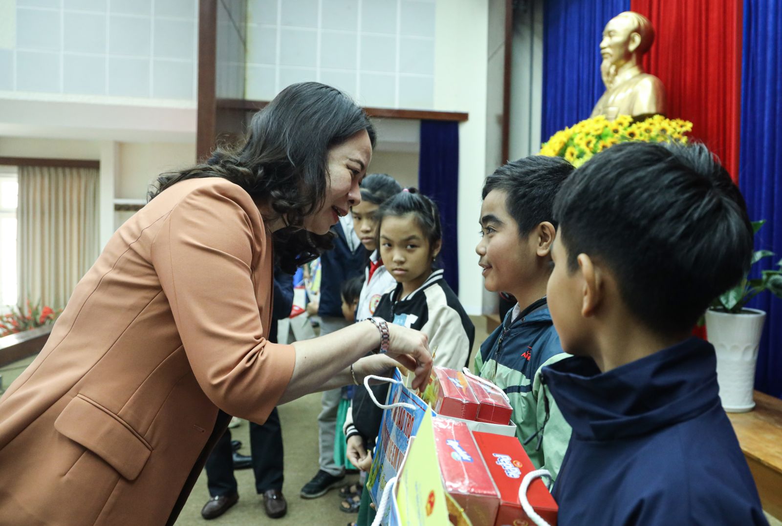 Phó Chủ tịch nước Võ Thị Ánh Xuân tặng quà cho trẻ em có hoàn cảnh khó khăn tỉnh Quảng Nam. Ảnh: VPCTN