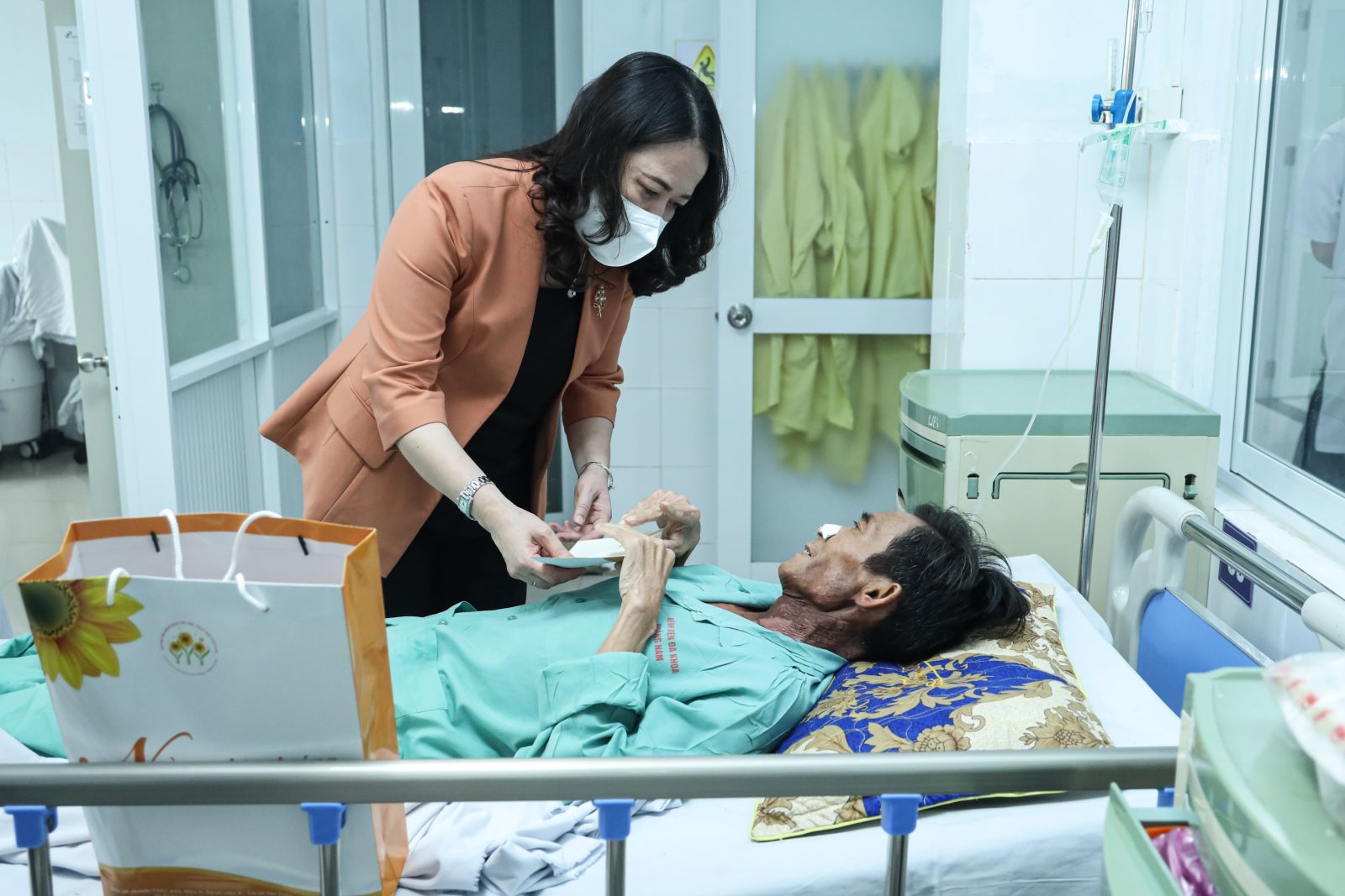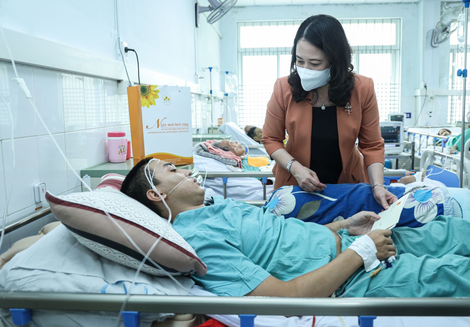 Phó Chủ tịch nước Võ Thị Ánh Xuân thăm, tặng quà bệnh nhân ung thư tại Bệnh viện Đa khoa tỉnh Quảng Nam. Ảnh: VPCTN