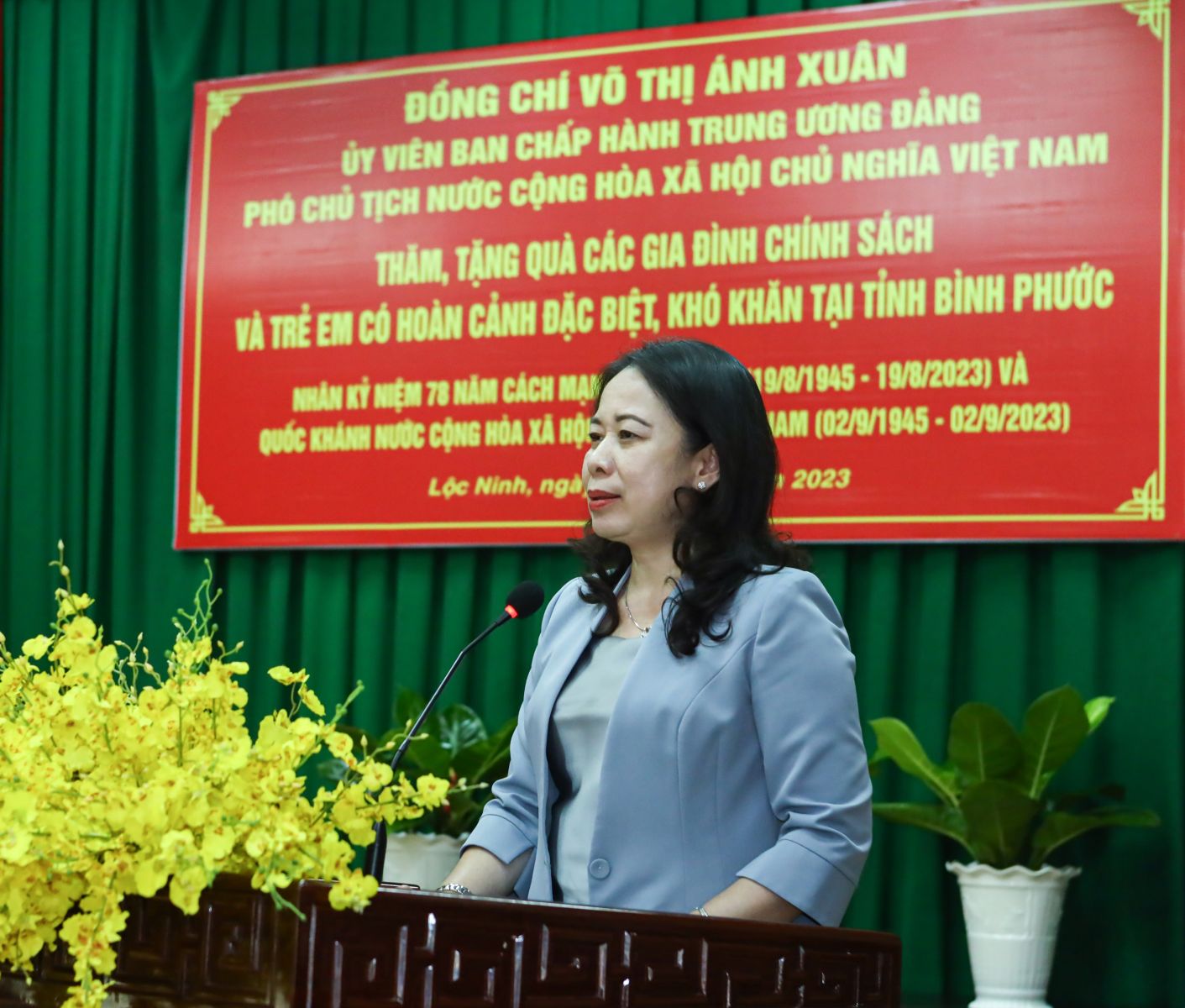 Phát biểu tại buổi làm việc, Phó Chủ tịch nước Võ Thị Ánh Xuân đã chia sẻ những khó khăn và biểu dương các gia đình chính sách, gia đình có công với cách mạng đã nỗ lực vươn lên, góp phần xây dựng quê hương đất nước. Đồng thời động viên các cháu học sinh vượt qua khó khăn rèn luyện, học tập tốt có kết quả cao.