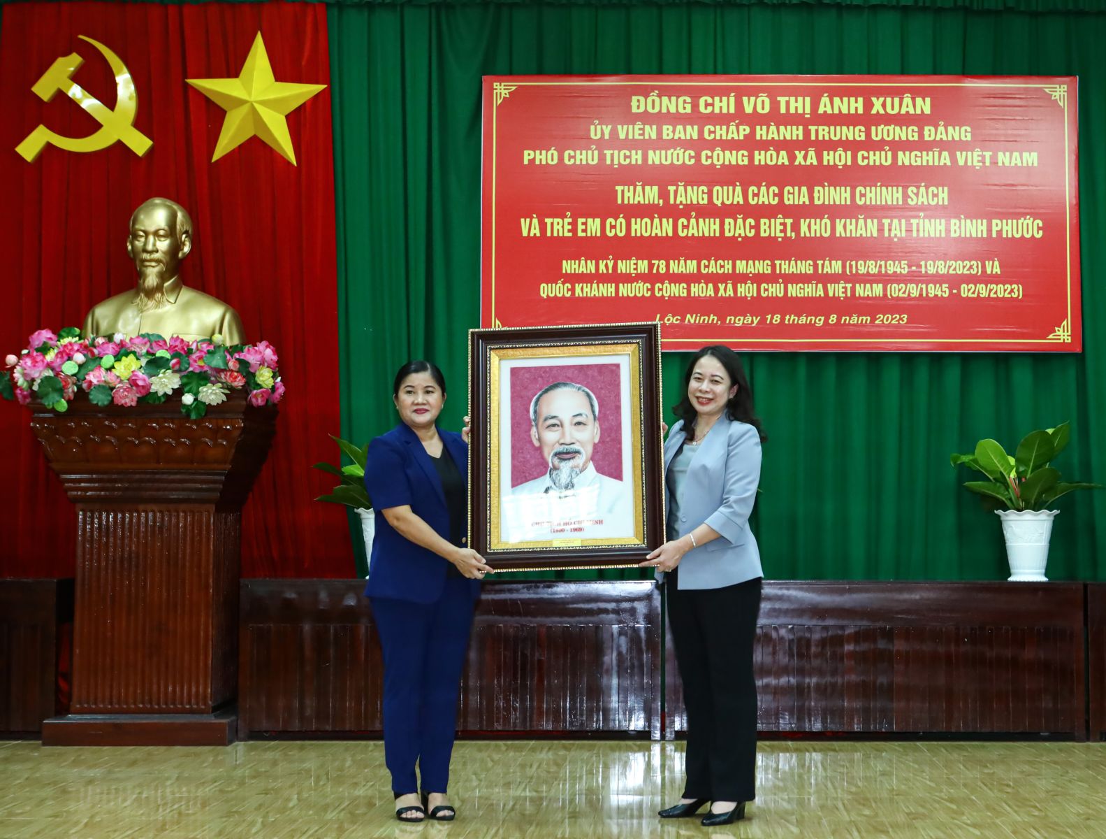 Phó Chủ tịch nước Võ Thị Ánh Xuân tặng tranh chân dung Chủ tịch Hồ Chí Minh cho Đảng bộ, chính quyền và nhân dân tỉnh Bình Phước. Ảnh: VPCTN