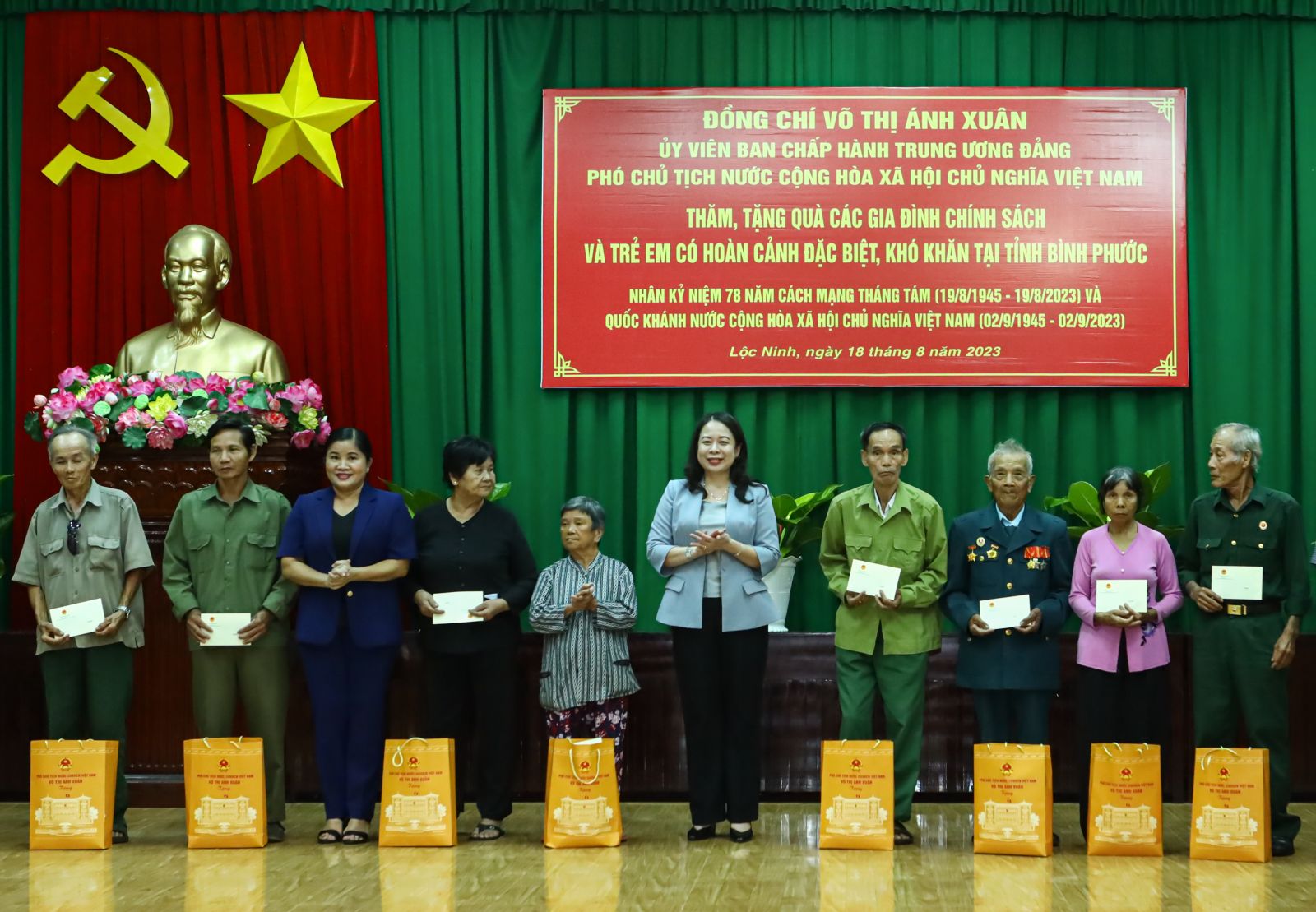 Phó Chủ tịch nước Võ Thị Ánh Xuân tặng quà cho các gia đình chính sách, người có công tại tỉnh Bình Phước. Ảnh: VPCTN