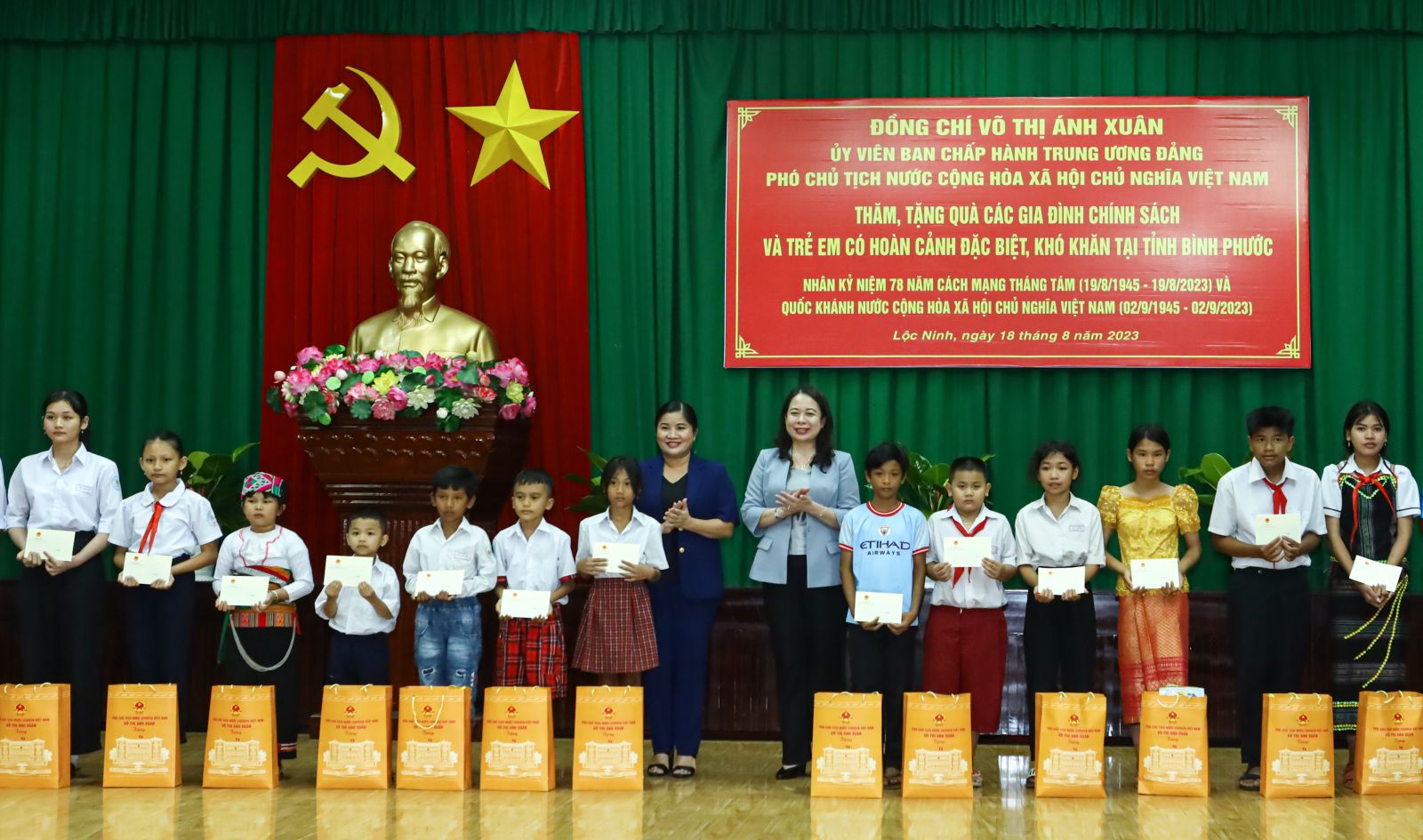 Dịp này, Phó Chủ tịch nước đã tặng quà cho Đảng bộ, chính quyền và nhân dân tỉnh Bình Phước, huyện Lộc Ninh cùng 30 hộ gia đình chính sách, 30 em học sinh khó khăn có thành tích học tập tốt; thăm 2 gia đình chính sách ngành công an trên địa bàn huyện.