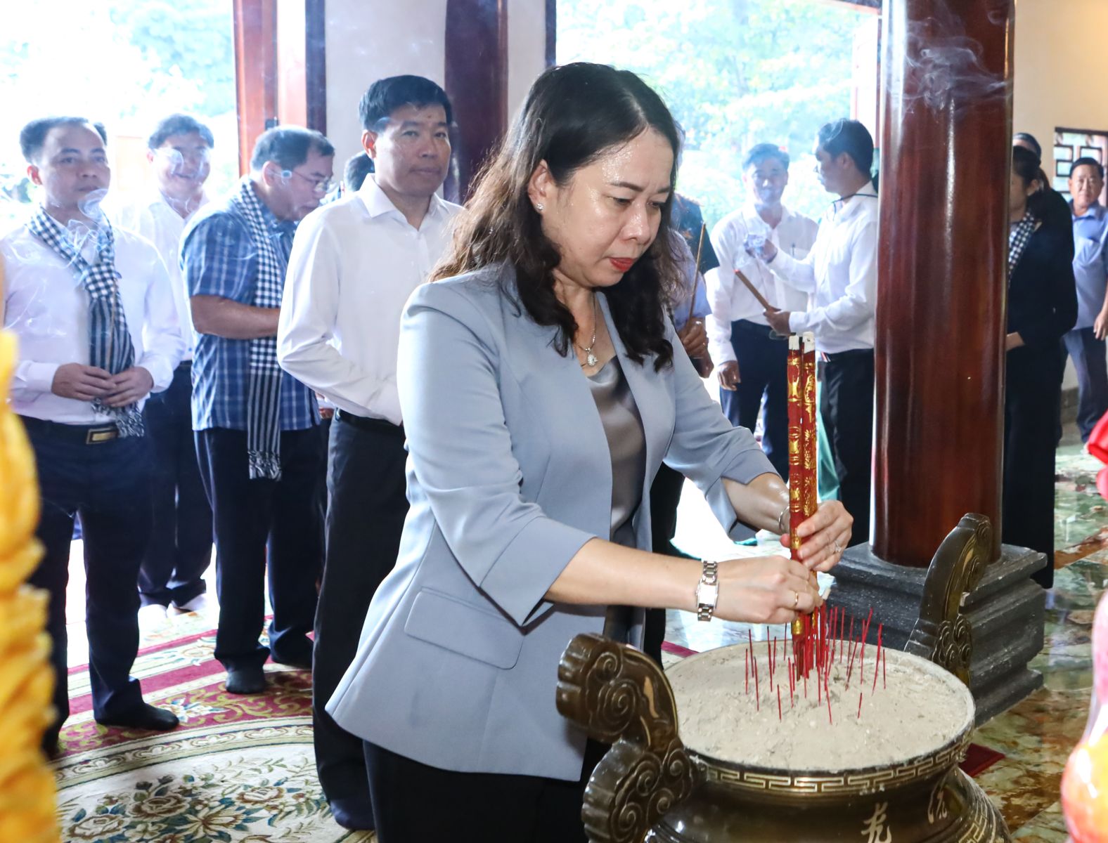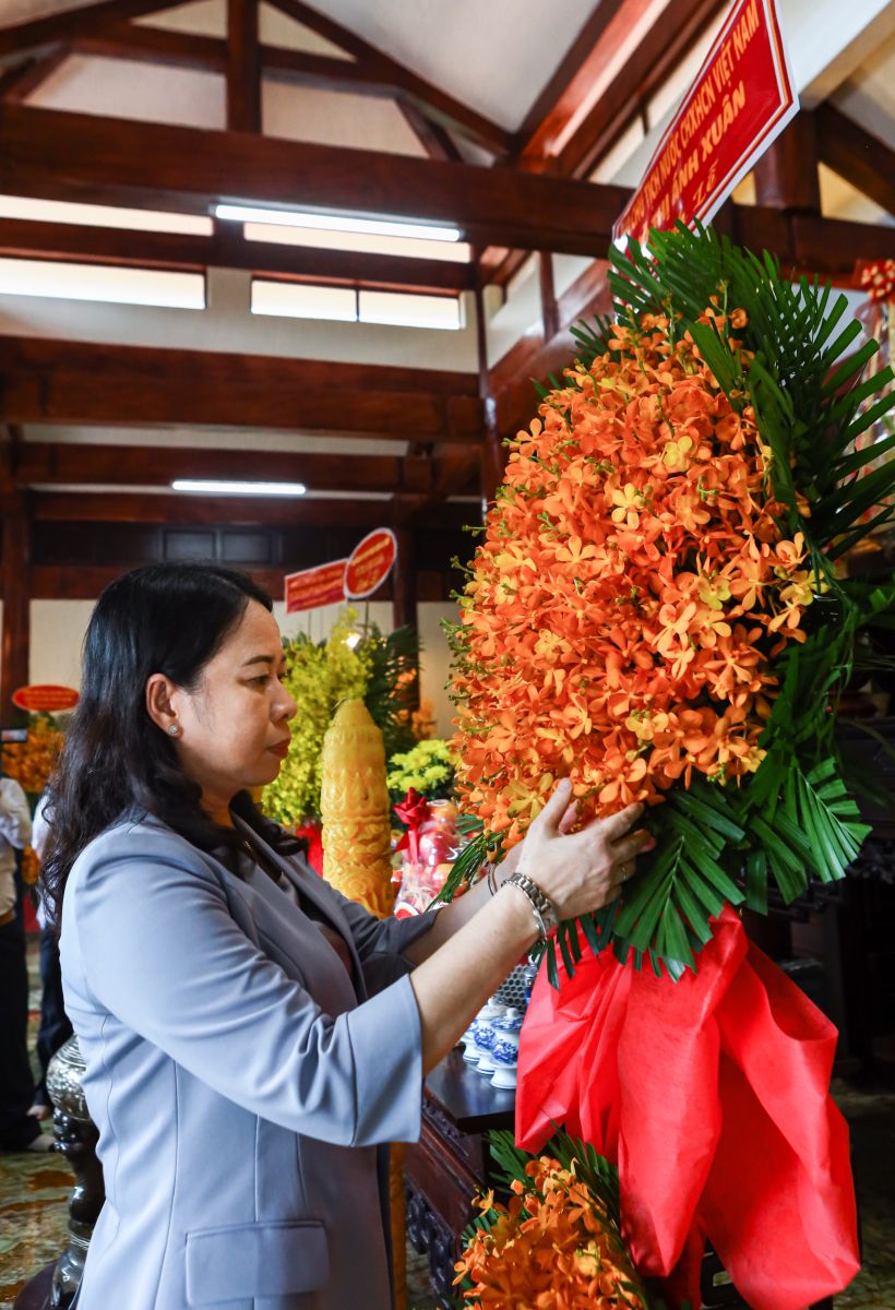 Phó Chủ tịch nước Võ Thị Ánh Xuân dâng hương, dâng hoa tại Đền thờ Bác Hồ và lãnh đạo Bộ Chỉ huy Quân giải phóng miền Nam Việt Nam. Ảnh: VPCTN
