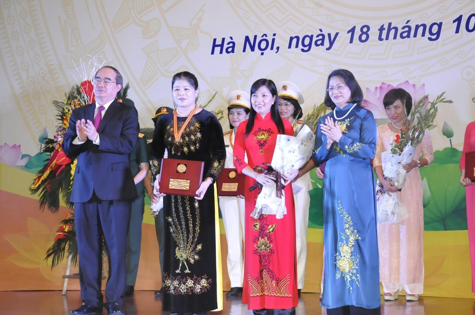 Chủ tịch TƯ MTTQ VN Nguyễn Thiện Nhân và Phó Chủ tịch nước Đặng Thị Ngọc Thịnh trao giải thưởng Phụ nữ Việt Nam cho những tập thể, cá nhân tiêu biểu - Ảnh Mạnh Tiến