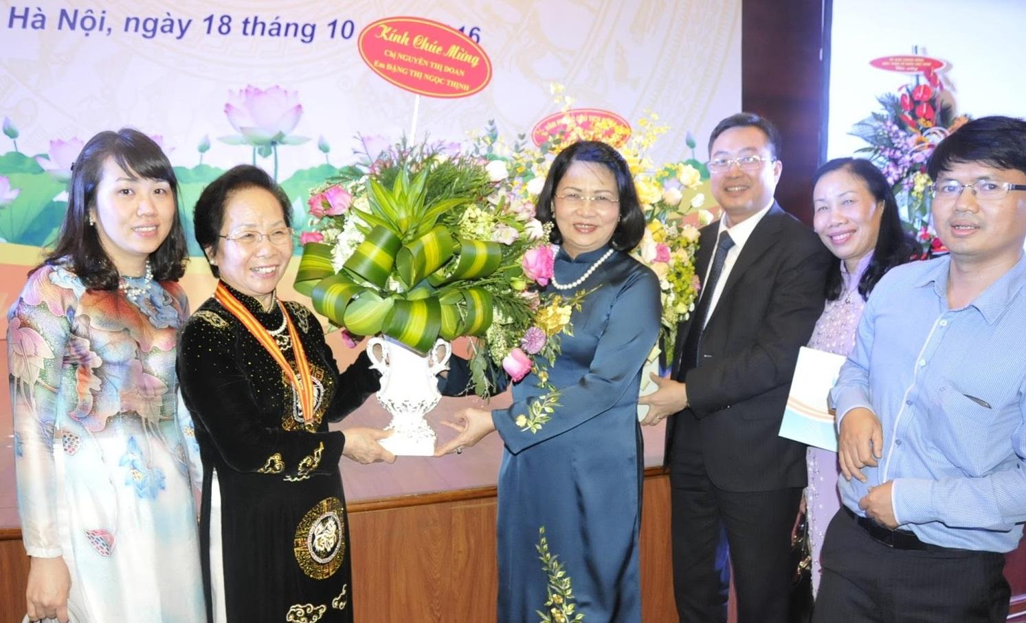 Phó Chủ tịch nước Đặng Thị Ngọc Thịnh và Văn phòng Chủ tịch nước tặng hoa chúc mừng nguyên Phó Chủ tịch nước Nguyễn Thị Doan nhận giải thưởng Phụ nữ Việt Nam năm 2016 - Ảnh Mạnh Tiến