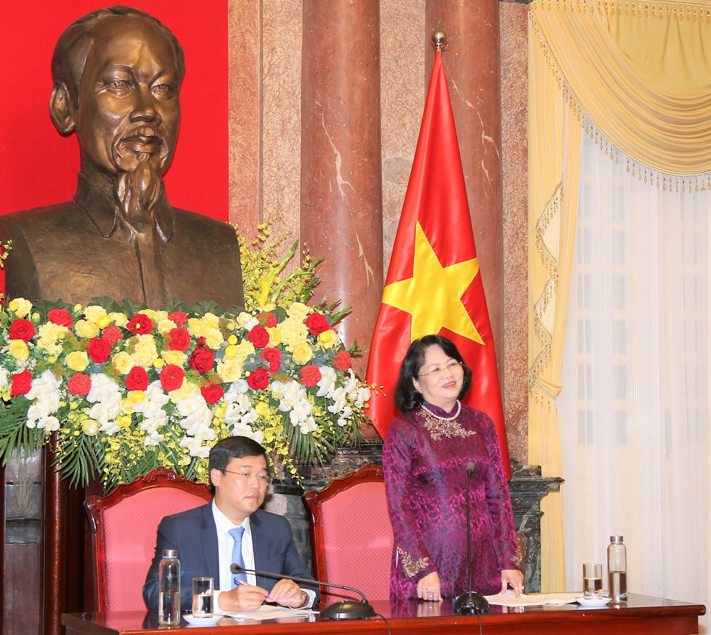 Phó Chủ tịch nước Đặng Thị Ngọc Thịnh với các đại biểu dự cuộc gặp mặt. (Ảnh: VPCTN/Công Gôn)