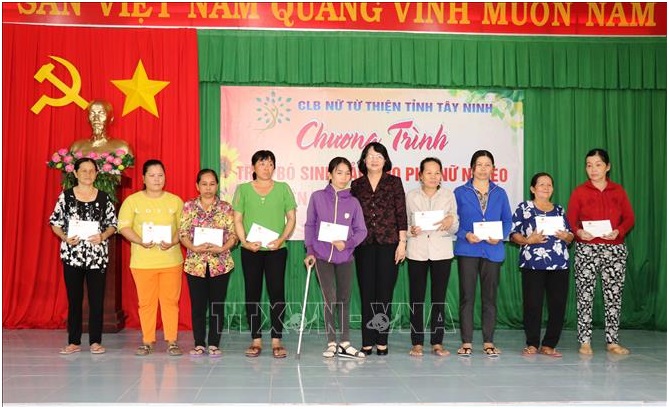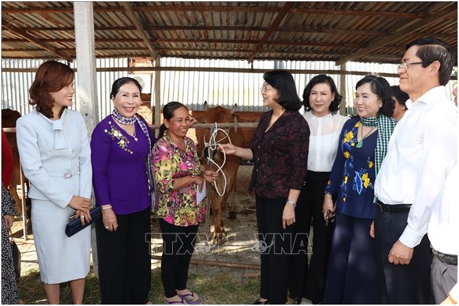 Phó Chủ tịch nước Đặng Thị Ngọc Thịnh cùng Câu lạc bộ phụ nữ từ thiện Tây Ninh tặng bò cho phụ nữ nghèo.