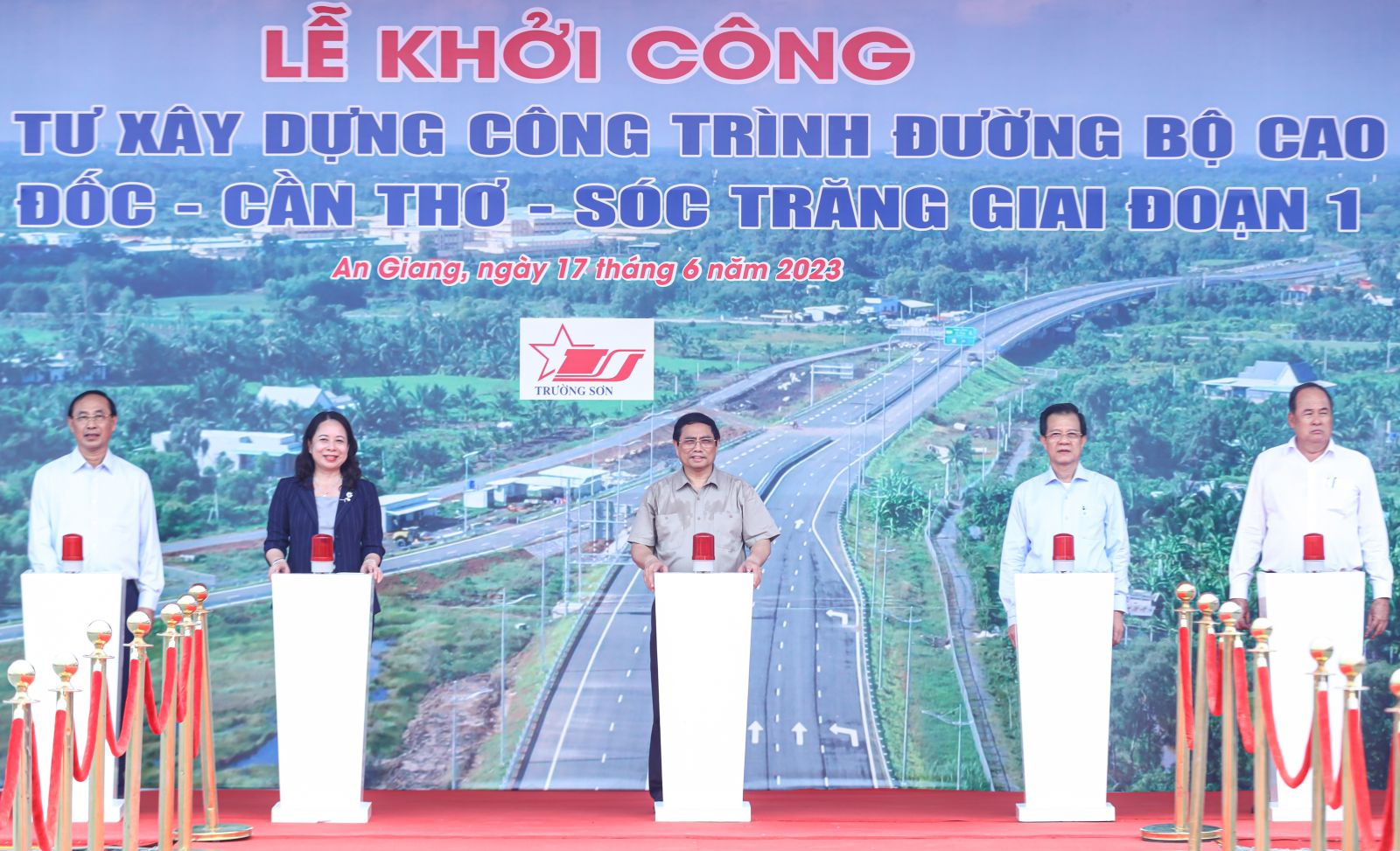 Thủ tướng Phạm Minh Chính và Phó Chủ tịch nước Võ Thị Ánh Xuân cùng các đại biểu thực hiện nghi thức ấn nút khởi công tuyến đường bộ cao tốc Châu Đốc - Cần Thơ - Sóc Trăng giai đoạn 1. Ảnh: VPCTN