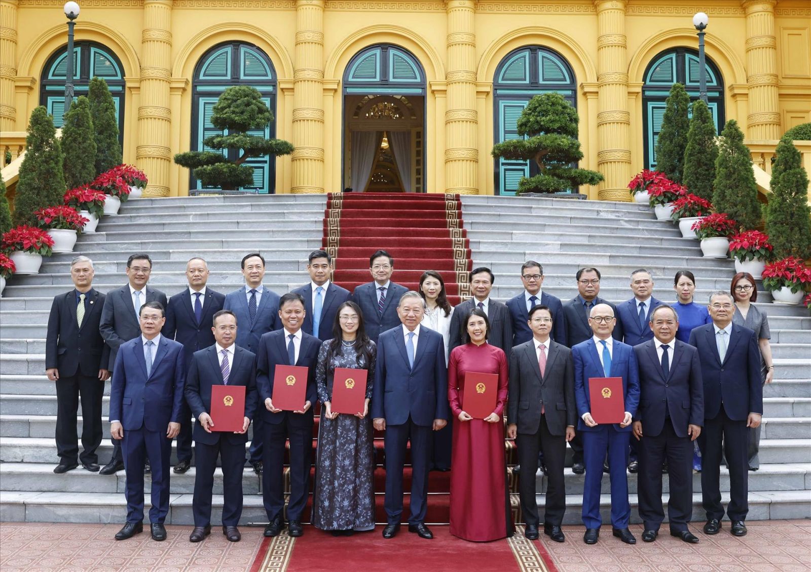 Tổng Bí thư, Chủ tịch nước Tô Lâm chụp ảnh cùng các đại biểu và các Đại sứ được trao Quyết định.