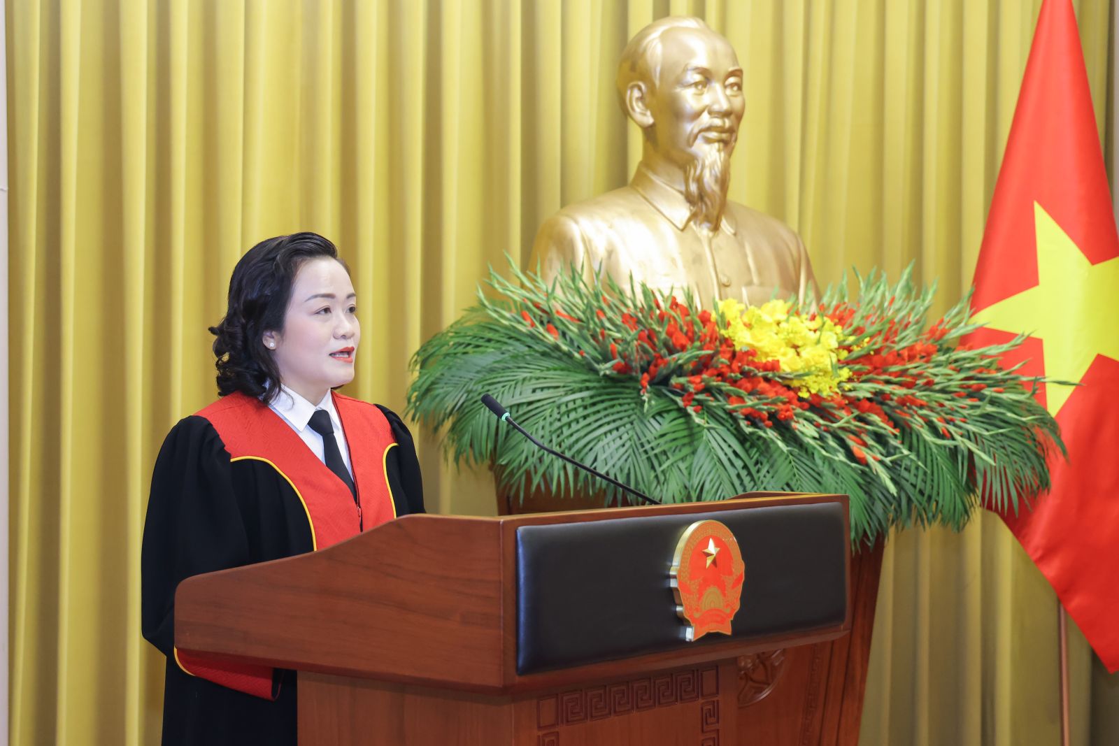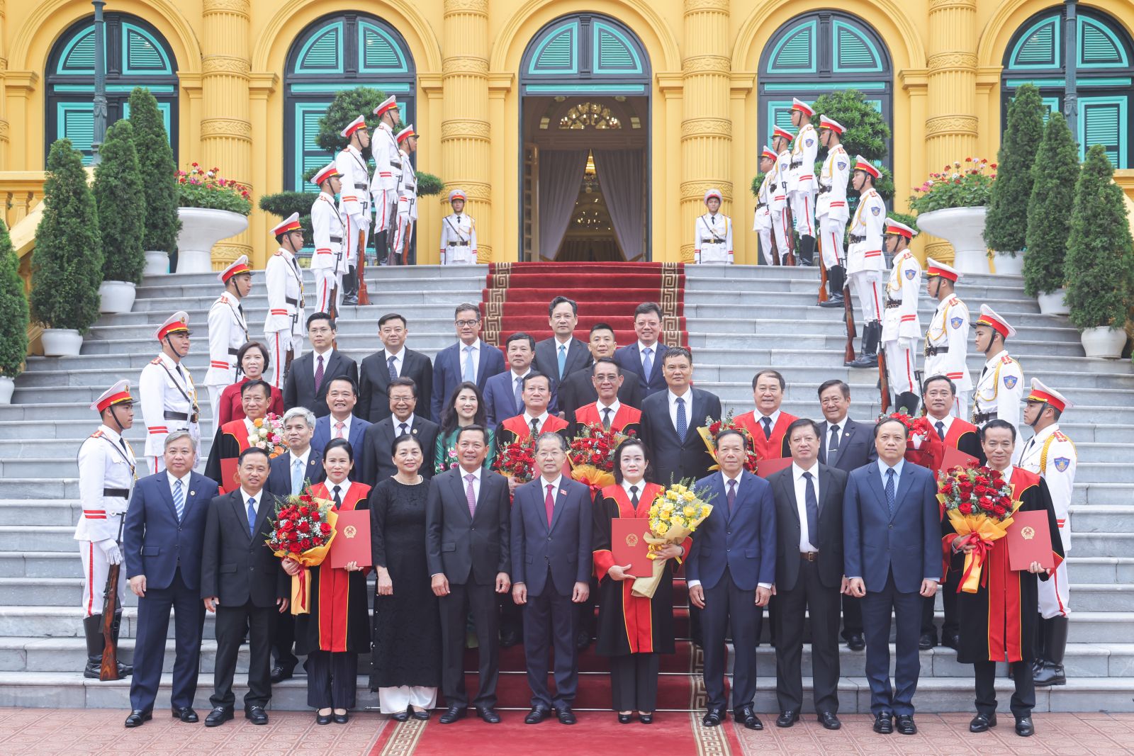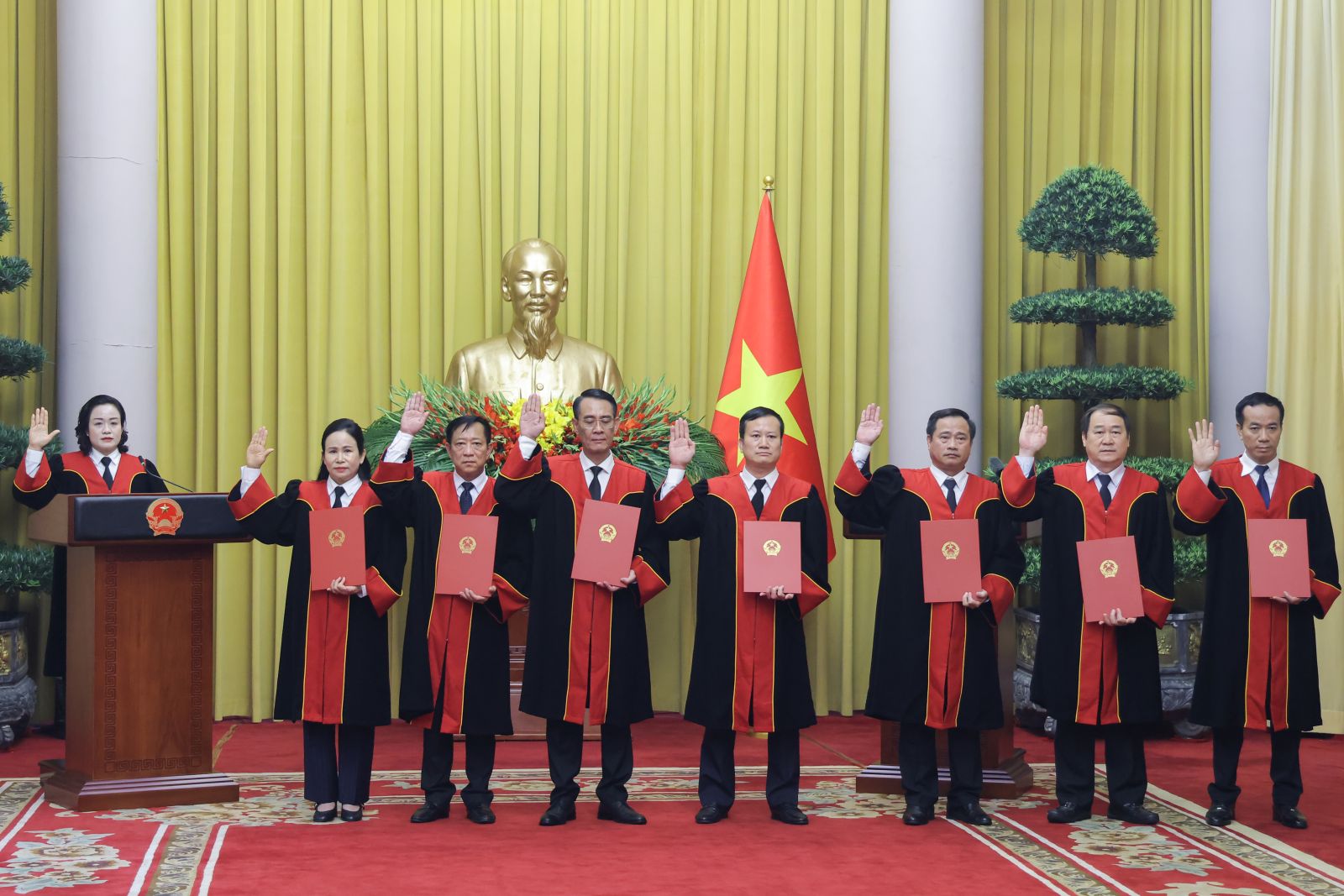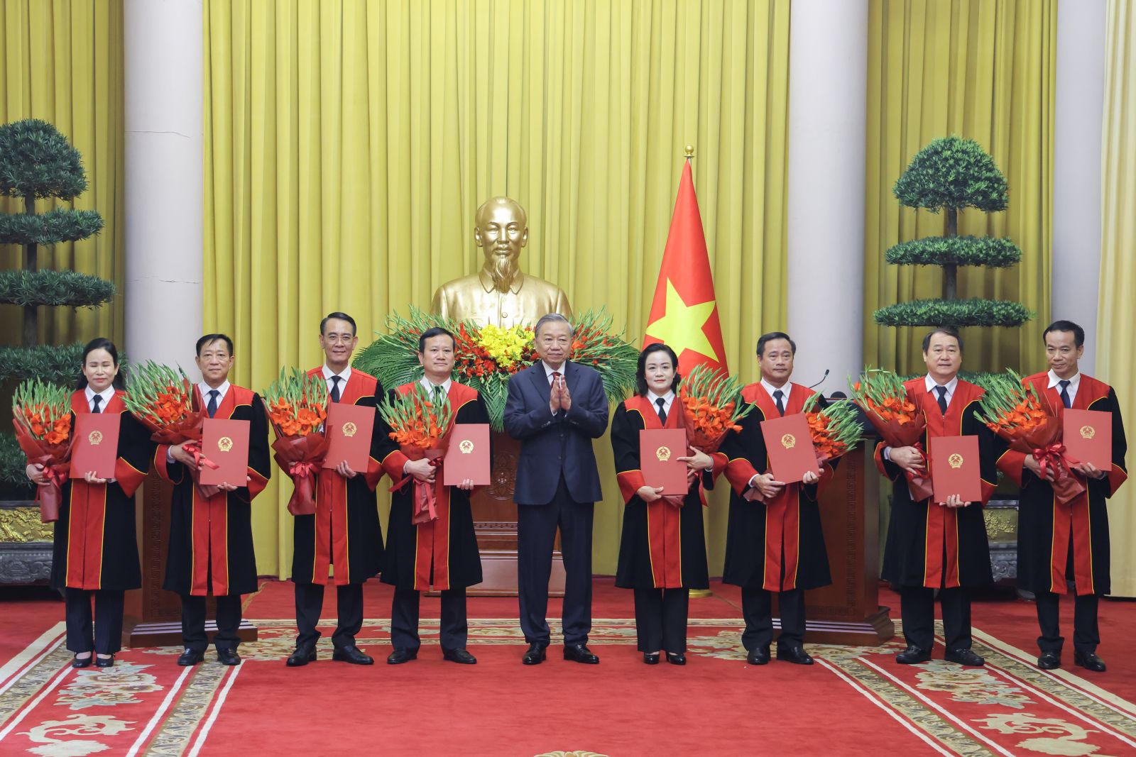 Tại buổi lễ, Phó Chủ nhiệm Văn phòng Chủ tịch nước Phạm Thanh Hà đã công bố quyết định của Chủ tịch nước bổ nhiệm chức danh Thẩm phán Tòa án nhân dân Tối cao đối với các đồng chí: Nguyễn Hải Trâm, Ủy viên Trung ương Đảng, Ủy viên Ban Thường vụ Đảng ủy các cơ quan Đảng Trung ương, Phó Bí thư Thường trực Đảng ủy Tòa án nhân dân Tối cao; Nguyễn Văn Cường, Thẩm phán Tòa án nhân dân bậc 3, Tòa phúc thẩm Tòa án nhân dân tối cao tại Hà Nội; Lê Hưng Dũng, Thẩm phán Tòa án nhân dân bậc 3, Chánh án Tòa án nhân dân tỉnh Khánh Hòa; Lê Thanh Phong, Thẩm phán Tòa án nhân dân bậc 3, Chánh án Tòa án nhân dân Thành phố Hồ Chí Minh; Đỗ Mạnh Tăng, Thẩm phán Tòa án nhân dân bậc 3, Chánh án Tòa án nhân dân tỉnh Hưng Yên; Nguyễn Hải Thanh, Thẩm phán Tòa án nhân dân bậc 3, Tòa Phúc thẩm Tòa án nhân dân tối cao tại Hà Nội; Nguyễn Hữu Tuyến, Thẩm phán Tòa án nhân dân bậc 3, Chánh án Tòa án nhân dân tỉnh Quảng Trị; Đỗ Thị Hải Yến, Thẩm phán Tòa án nhân dân bậc 3, Vụ trưởng Vụ Giám đốc, kiểm tra về dân sự Tòa án nhân dân tối cao.