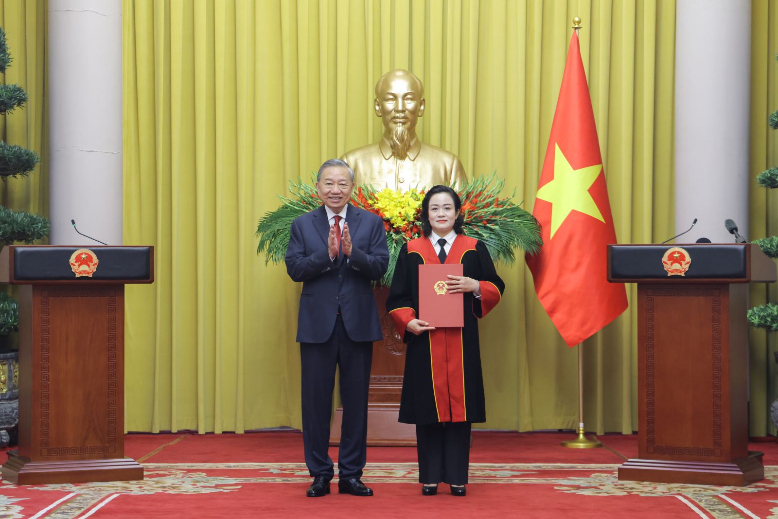 Tổng Bí thư, Chủ tịch nước Tô Lâm trao Quyết định bổ nhiệm chức vụ Phó Chánh án Tòa án nhân dân Tối cao đối với Thẩm phán Tòa án nhân dân Tối cao Nguyễn Hải Trâm. Ảnh: VPCTN
