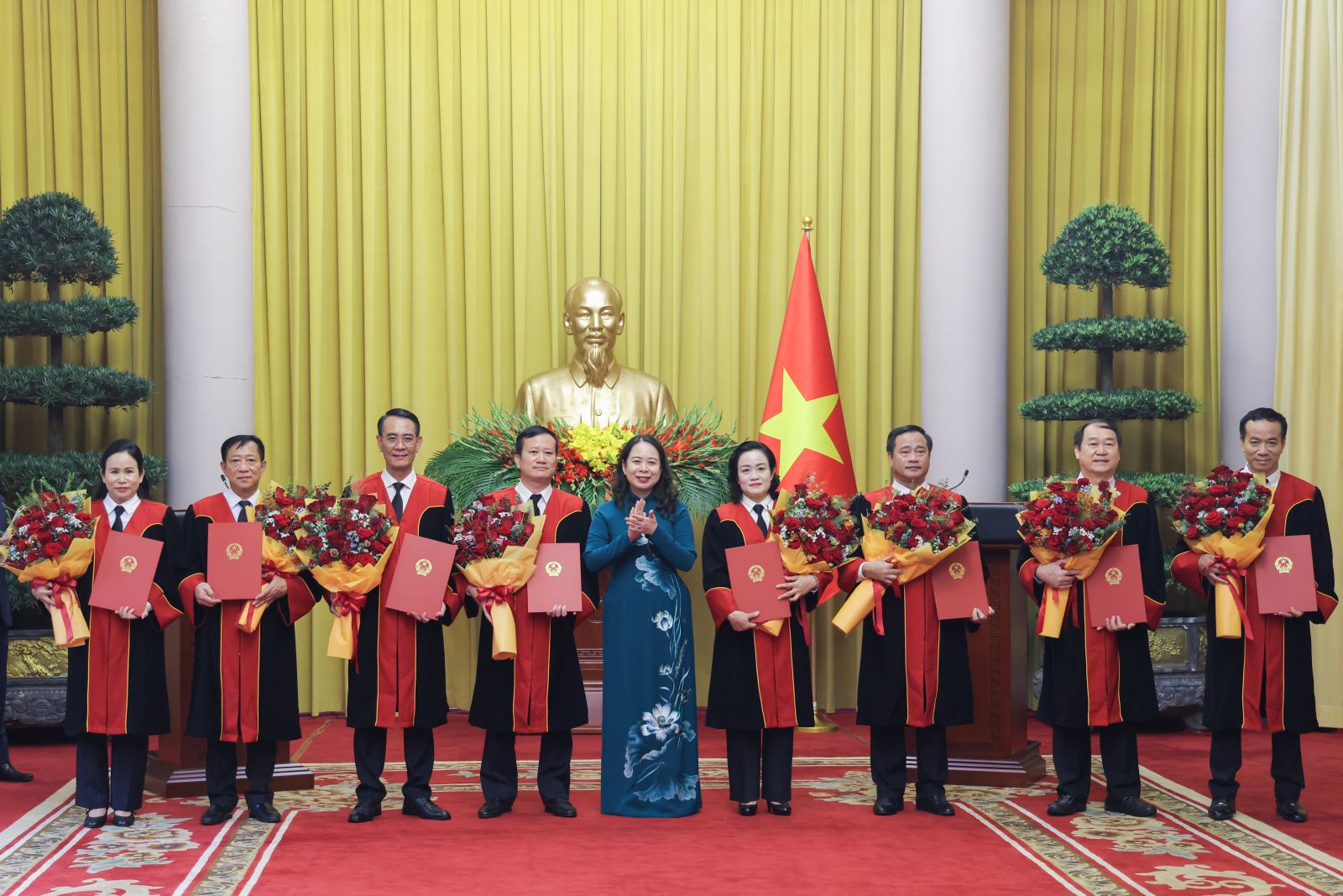 Bí thư Trung ương Đảng, Phó Chủ tịch nước Võ Thị Ánh Xuân tặng hoa chúc mừng các Thẩm phán Tòa án nhân dân Tối cao nhận Quyết định bổ nhiệm. Ảnh: VPCTN