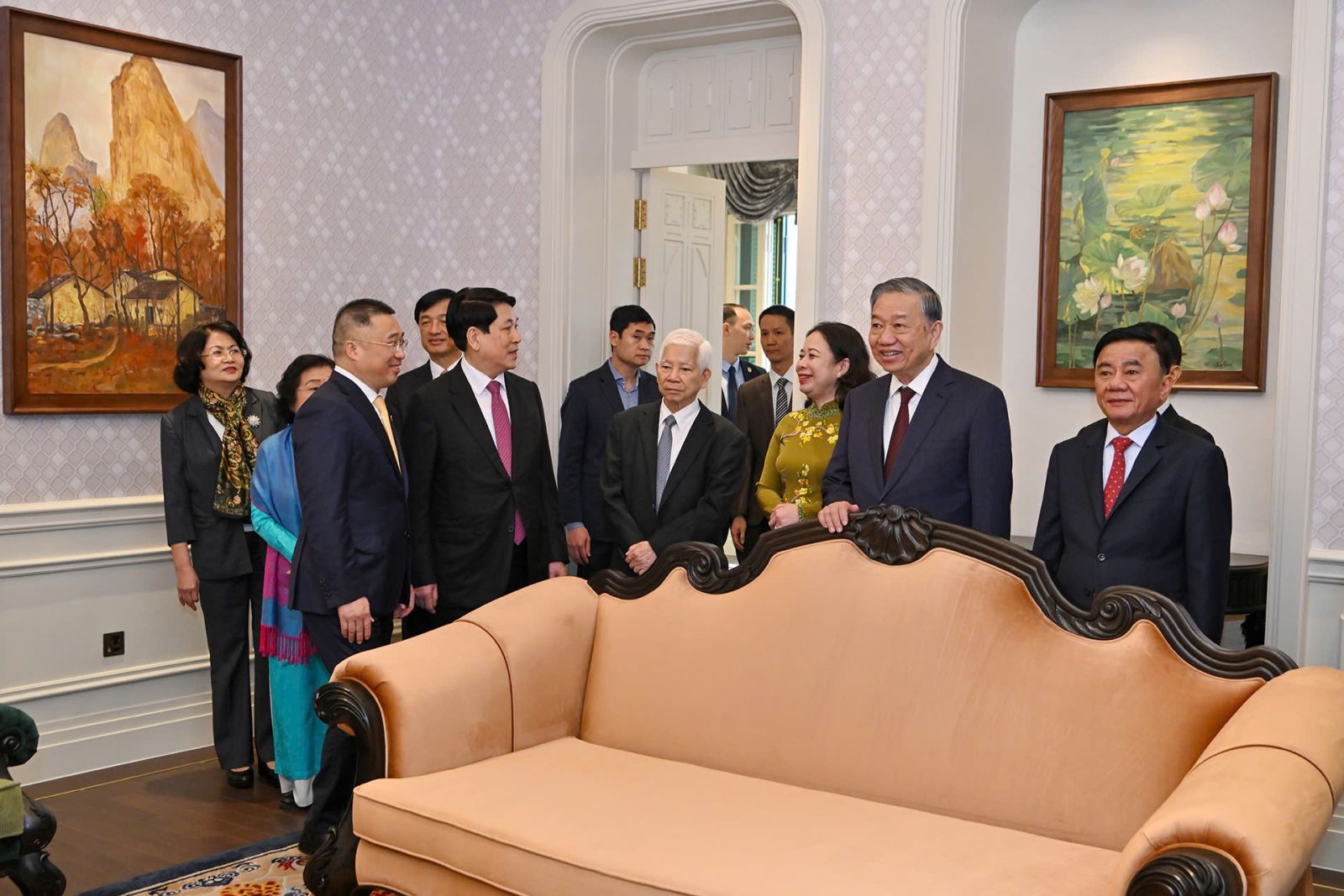 Tổng Bí thư Tô Lâm, Chủ tịch nước Lương Cường, Thường trực Ban Bí thư Trần Cẩm Tú và các đồng chí lãnh đạo, nguyên lãnh đạo Đảng, Nhà nước tham quan trụ sở làm việc Cơ quan Chủ tịch nước tại số 2 Lê Thạch. Ảnh: VPCTN